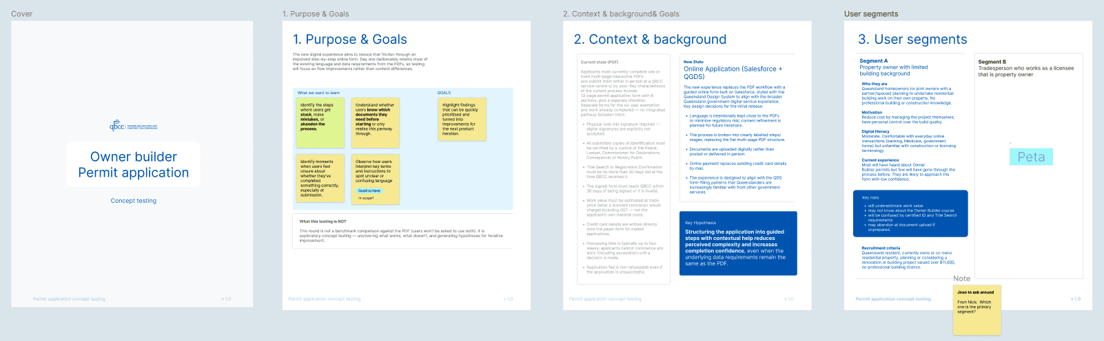 With 20 prototype screens ready, the next step was structuring how we'd actually test them. I used Copilot to help plan the user testing scenarios and session structure, mapping each screen to the real-world situations QBCC customers would face: applying for a new licence, managing financial declarations, navigating the deed of covenant.