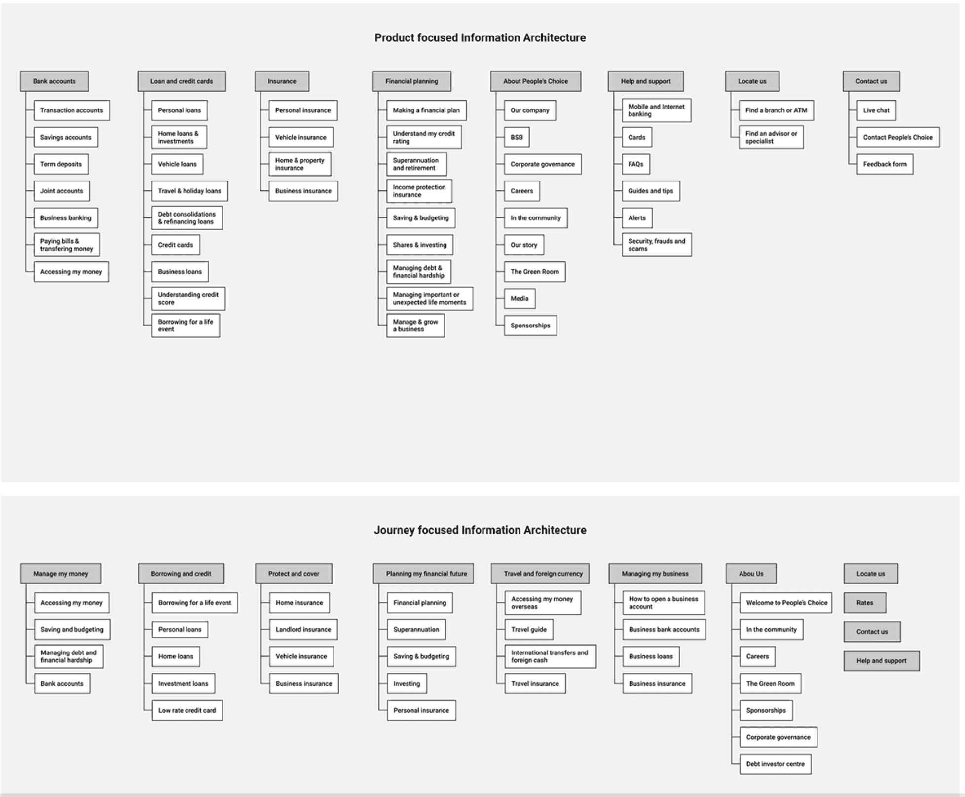 Product-based IA — organised around traditional banking categories like “Loans,” “Accounts,” “Insurance.”
